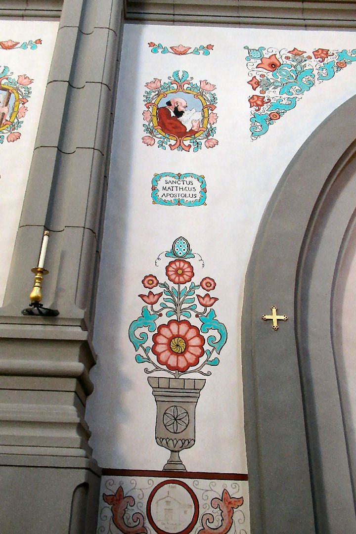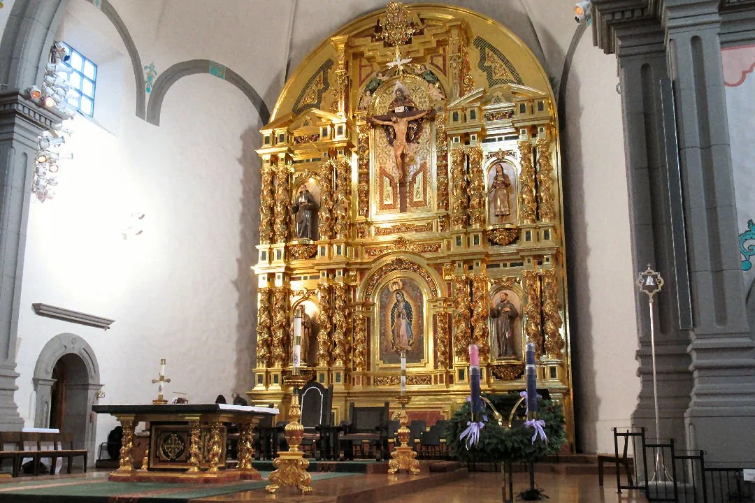 The modern Baslica echoes the shape of the short-lived Great Stone Church, ruined in an earthquake in 1812. The Basilica operates as a separate church outside of the Mission grounds. The altar-piece is ornate, there are statues of Catholic saints mounted in wall niches and bright painted decoration embellishes the plaster work.
