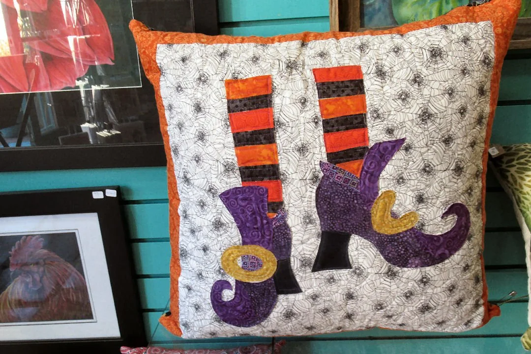 Textiles and paintings displayed to tempt would-be purchasers.